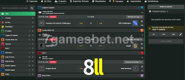 O 8ll oferece uma grande seleção de opções de apostas em e-sports com probabilidades competitivas